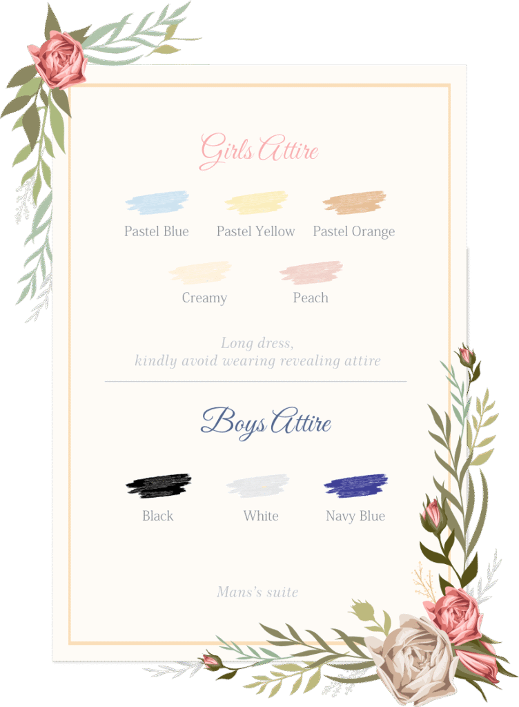 Kindly avoid wearing revealing attire. We appreciate your respect for the dress code and the celebrant’s wishes.